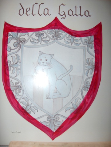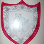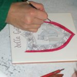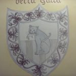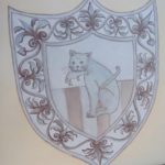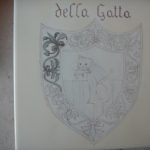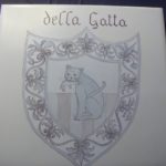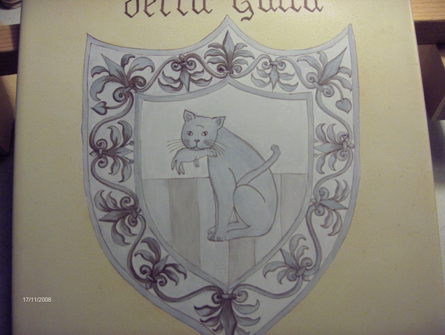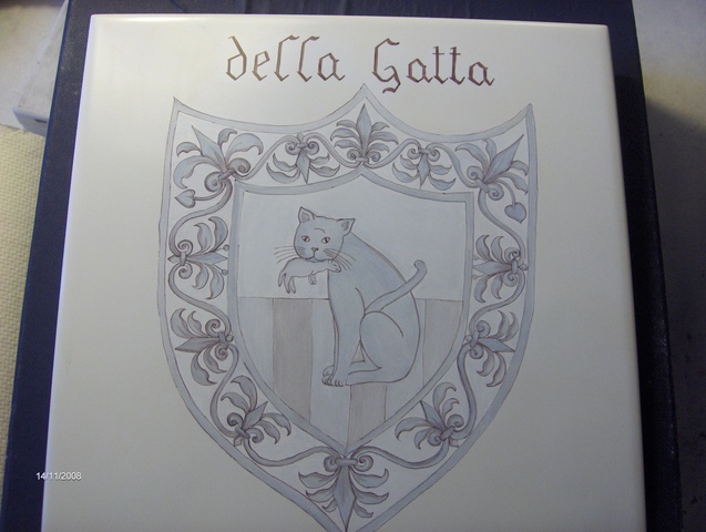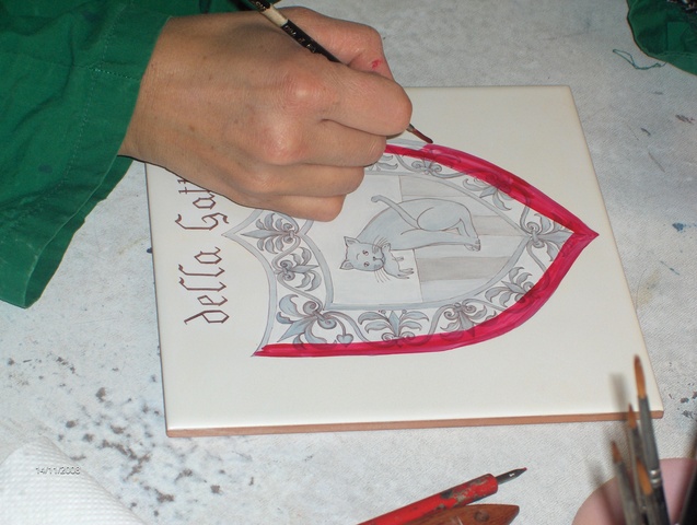 Ecco un esempio della decorazione di una mattonella: ho dato un fondo giallo avorio molto chiaro mentre ho decorato lo stemma centrale a pennino e colore grigio, quindi l’ho cotta una prima volta. Per la seconda cottura ho ripassato il colore sul disegno per scurirlo. Nella terza cottura è stata passata la lacca per coprire lo stemma e potere così scurire il giallo di fondo.